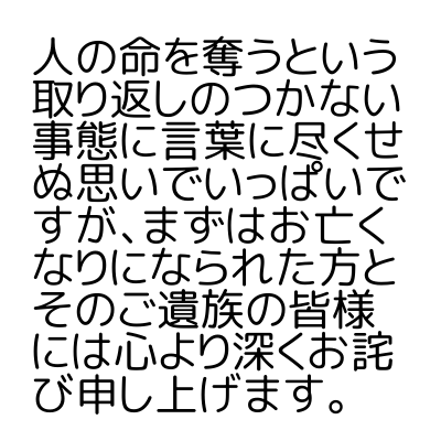 人の命を奪うという取り返しのつかない事態に言葉に尽くせぬ思いでいっぱいですが、まずはお亡くなりになられた方とそのご遺族の皆様には心より深くお詫び申し上げます。