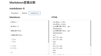 JavaScriptでMarkdown記法で書いたテキストをHTMLに変換する仕組みには代表的なものとして、Showdown, Marked, markdown-itがあります。