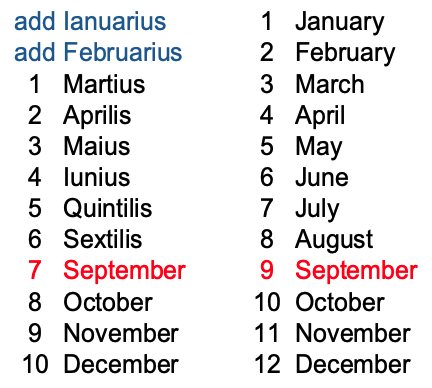 その後、紀元前713年に空白期間に1月と2月が挿入されましたが、その他の月の名前は変えなかったので、ずれてしまいました。